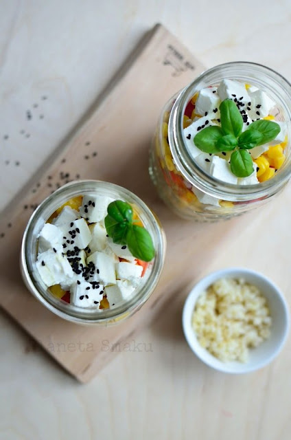Na dnie słoika ułożyć cukinię, przykryć połową kaszy, papryką, kukurydzą i fetą. Do każdego słoika wlać po łyżce oliwy. Posypać czarnuszką lub ulubionymi pestkami oraz solą i pieprzem. Zakręcić słoiczki i przechowywać w lodówce.