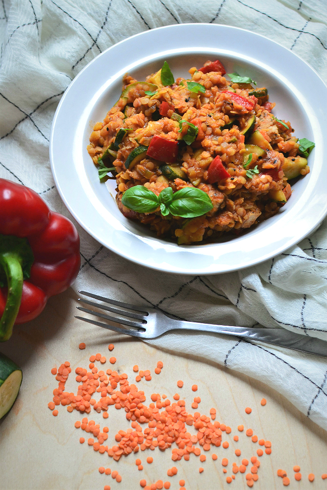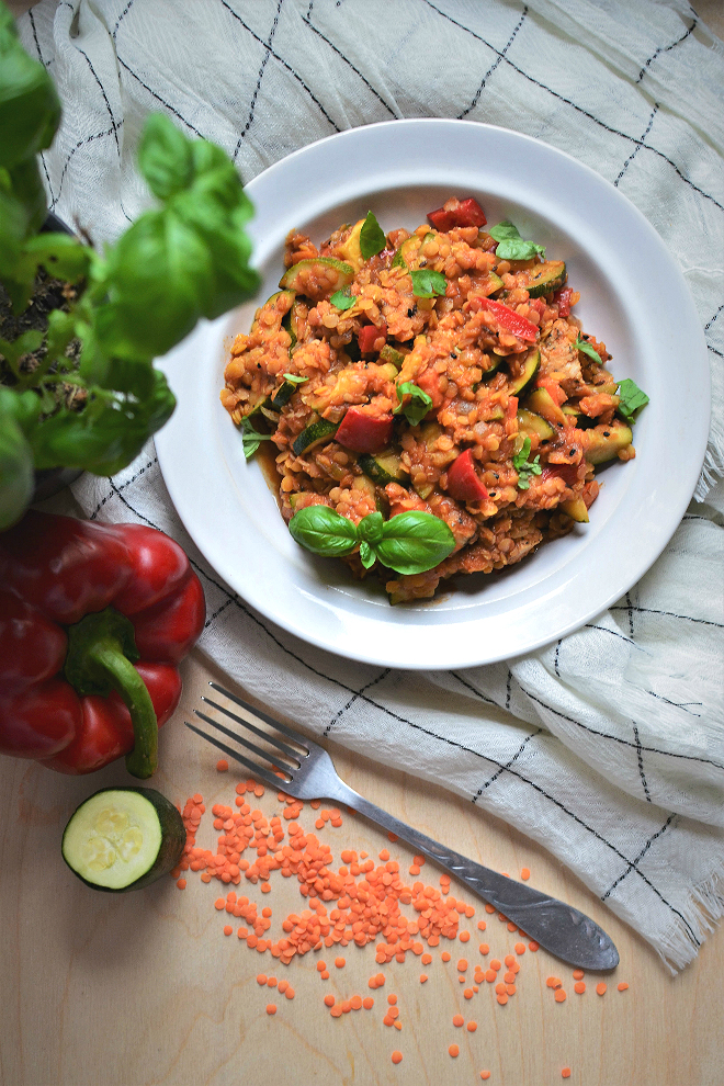 Czas to u mnie w październiku towar deficytowy. Właśnie rozpoczęłam ostatni rok studiów (kiedy to minęło?!), równolegle pracuję, staram się regularnie odwiedzać siłownię i przy tym wszystkich mieć też czas dla bliskich. Gdzie znaleźć w tym wszystkim czas na gotowanie? Jest ciężko, ale grunt to dobra organizacja. Nie wychodzę z domu bez posiłku i kilku przekąsek – to taki mój nawyk, z którego jestem naprawdę dumna 🙂 Dzięki temu unikam sytuacji, w których poza domem odzywa się we mnie wilczy głód; nie zapycham się niezdrowymi przekąskami ze sklepu, i – co ważne zwłaszcza dla studentów – oszczędzam pieniądze. Przygotowywanie szybkiego i zdrowego obiadu opanowałam do perfekcji. Dziś przedstawiam prosty, ale pyszny przepis na soczewicę z warzywami w sosie pomidorowym. Może wygląda niepozornie, ale syci na długo. Jeśli jesteście ciekawi, jak zrobić zdrowy obiad w 10 minut, spróbujcie tego dania!