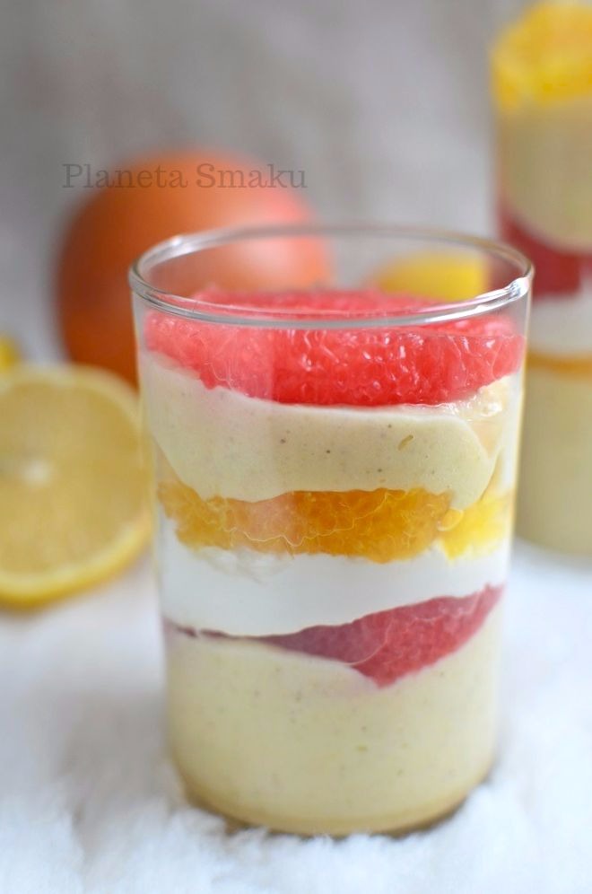 Do wysokich szklanek nakładać na zmianę: krem jaglany, cząstki cytrusów i twarożek. Schłodzić przed podaniem.
