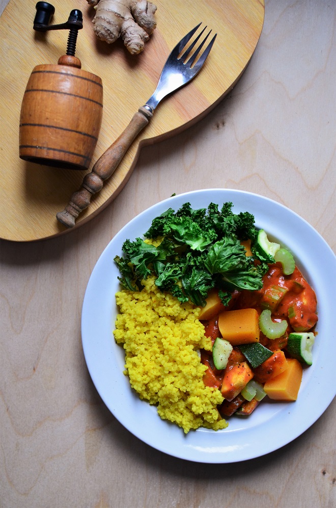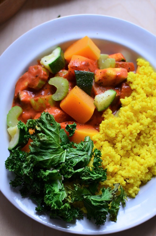 Prawdziwa misa mocy – kasza jaglana z lekkim curry, warzywami na parze i chrupiącym jarmużem to obiad, który mogłabym jeść codziennie! Połączenie prostych składników i aromatycznych przypraw przenosi zwykłe danie na inny poziom. To propozycja na zdrowy, wegański obiad, który jednocześnie syci i dodaje energii. Jeśli szukacie pomysłu na warzywne curry, nie będziecie zawiedzeni. Spójrzcie tylko na te kolory!