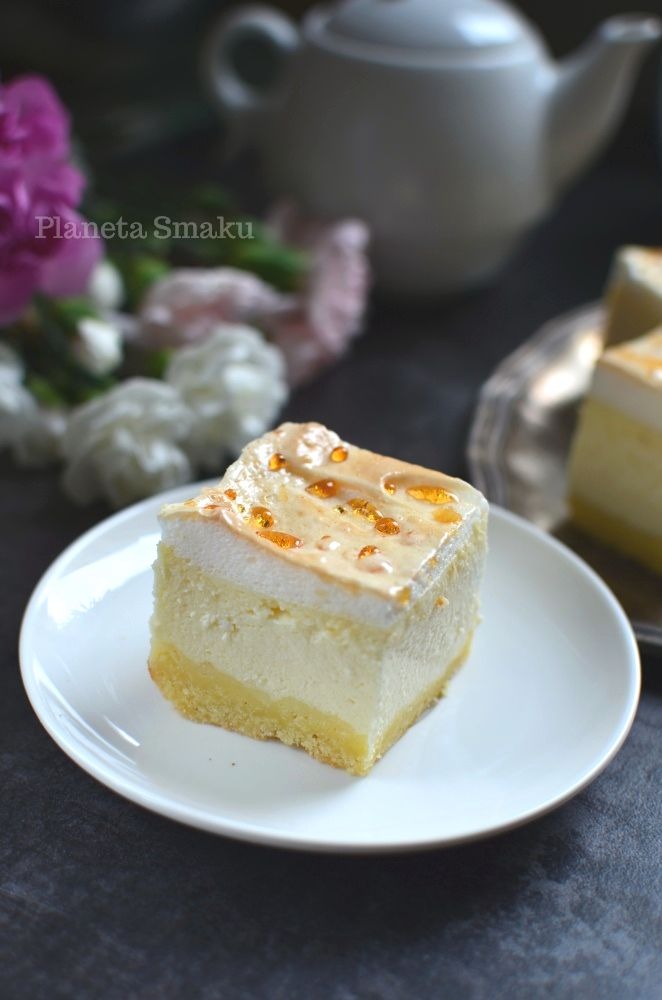 10 minut przed końcem pieczenia sernika przygotować bezę. Białka zacząć ubijać ze szczyptą soli, stopniowo dodawać cukier (po łyżce) i ubić na sztywną i gęstą pianę (zajmie to ok. 8-10 minut). Piankę bezową wyłożyć na gorący sernik i wygładzić powierzchnię. Łyżką można porobić fale na powierzchni bezy. Ciasto ponownie wstawić do piekarnika (150 stopni) na 15 minut. Od razu wyjąć sernik z piekarnika i ostudzić.